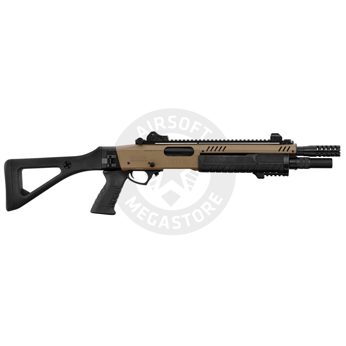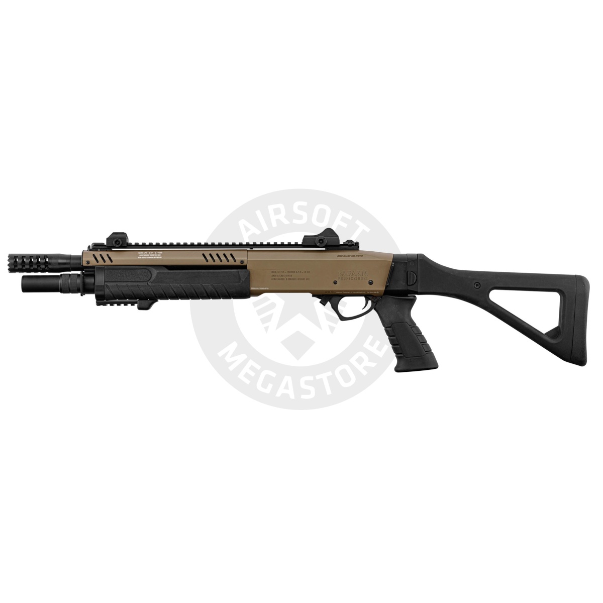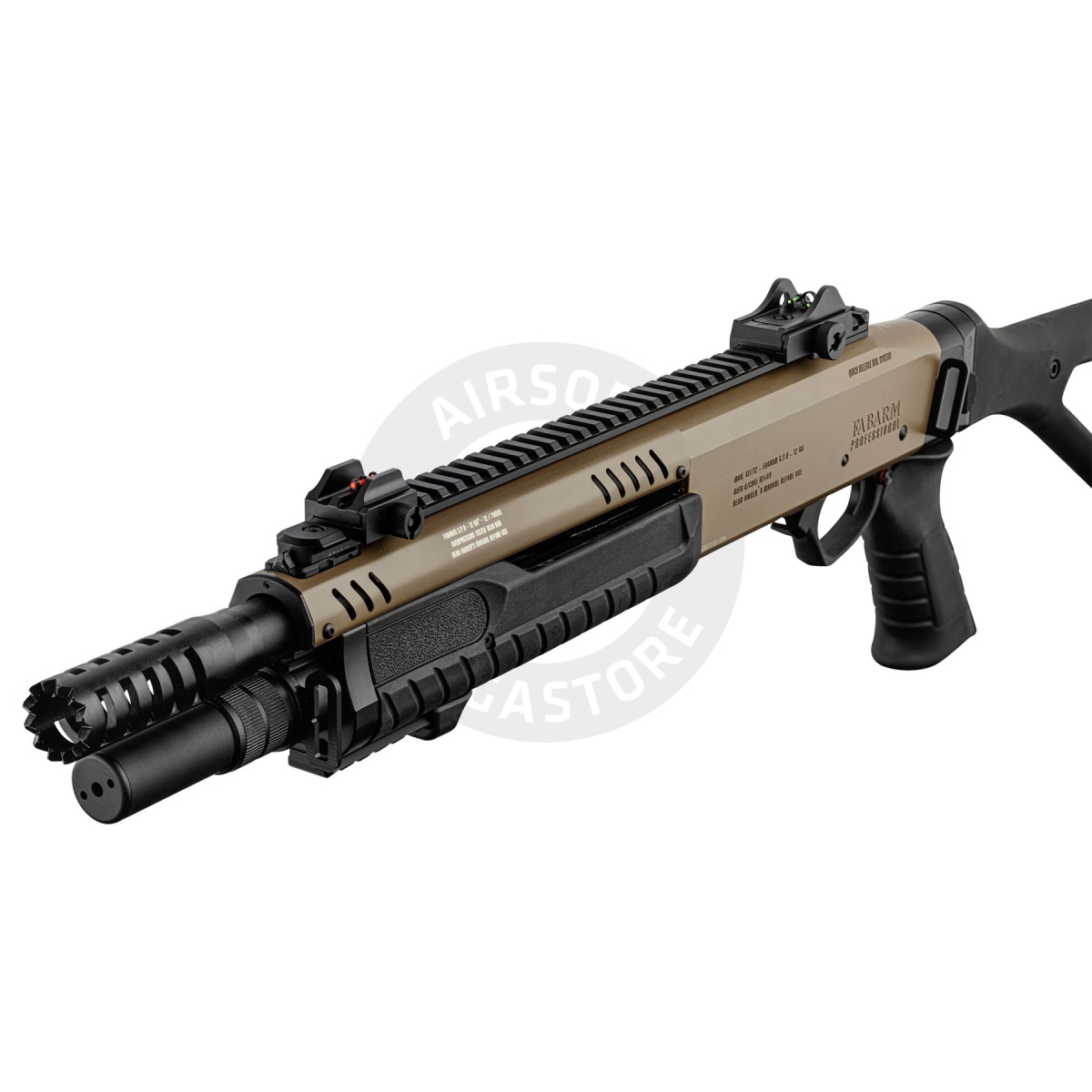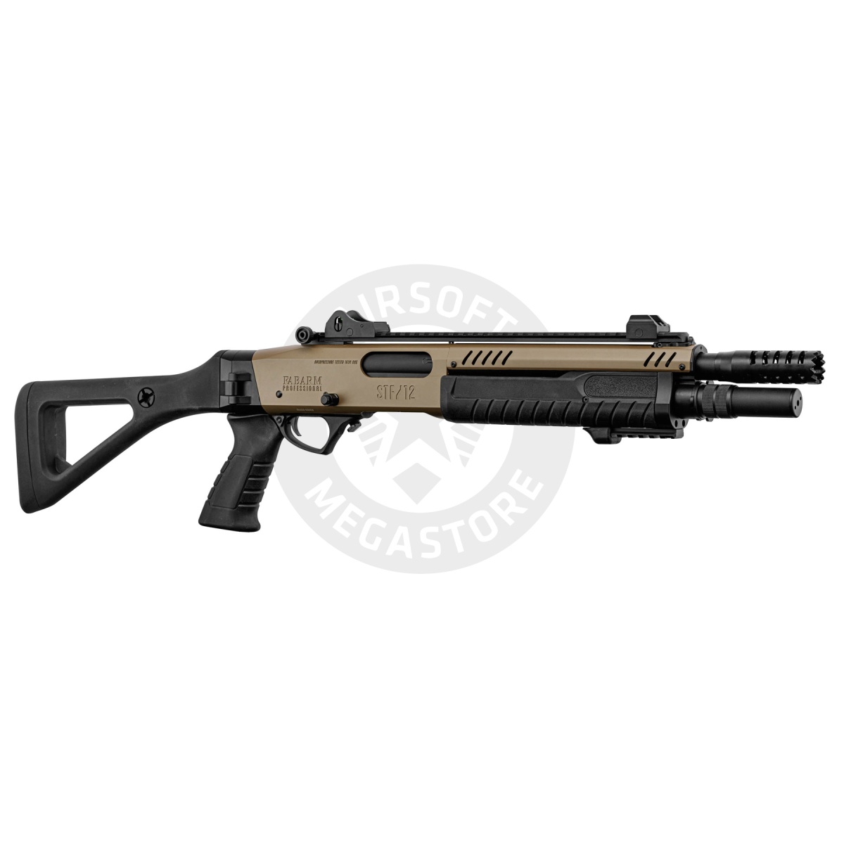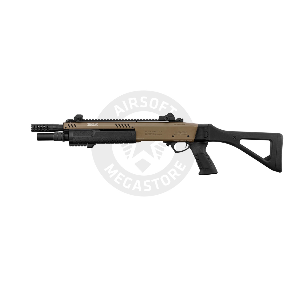 The Fabarm 33 inch Compact Gas Pump Shotgun Replica in tan is a powerful and authentic airsoft shotgun built for players who want realism, durability, and versatility on the field. Officially licensed by Fabarm, this replica captures the look and feel of the real steel firearm while providing performance that dominates in close quarters. It fires standard 6mm BBs with selectable modes of tri-shot or six-shot bursts, giving players the ability to adapt their spread for different combat scenarios. With a muzzle velocity of 300 to 310 FPS and an energy output of 0.9 joules, this shotgun delivers reliable power while staying field-safe. The shell-style magazine holds up to 30 rounds, maintaining the realism of tactical reloads. At 33 inches long and weighing in at 3 kilograms, the shotgun has a solid, full-metal body construction paired with a strong polymer barrel assembly, ensuring long-term durability and handling balance. This Fabarm shotgun isn't just about raw performance-it also offers a premium finish and modern features. The Cerakote coating gives the replica a professional-grade finish, while the aggressively designed muzzle brake adds a tactical edge to its appearance. The ergonomic pistol grip and triangular stock provide excellent stability and comfort during extended gameplay, while the integrated sights and quick-release rail system offer flexibility for optics and accessories. The fore-end includes a 20mm Picatinny rail, allowing for easy attachment of flashlights, lasers, or vertical grips to enhance your tactical loadout. Whether you are storming a CQB arena or holding ground in an outdoor skirmish, the Fabarm 33 inch Compact Gas Pump Shotgun Replica delivers authenticity, versatility, and rugged construction in one package. With its officially licensed design and gas-powered performance, this shotgun is a must-have for airsoft enthusiasts seeking a reliable and realistic sidearm alternative.