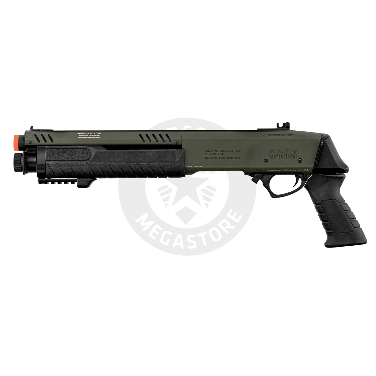 Elevate your airsoft game with the Fabarm 21" Short Initial Gas Pump Shotgun Replica in OD Green. Officially licensed by FABARM, it boasts an aggressive muzzle break and Cerakote finish. The strong polymer build, tri-shot spread, and full metal body ensure durability and performance. Featuring an ergonomic grip, 20mm Picatinny rail, and integrated sights, it offers customization and accuracy. The quick-release pivot system allows for rail removal. With a 30-shell capacity, 300-310 FPS velocity, and 0.9 Joules energy, this shotgun delivers power and precision. Dominate the field with this top-tier replica, exclusively available at Airsoft Megastore. Order now for a tactical advantage and an unmatched airsoft experience.