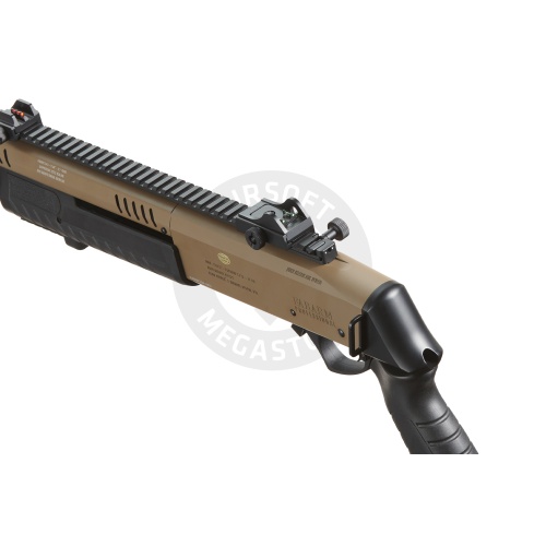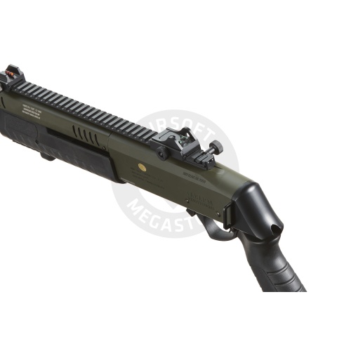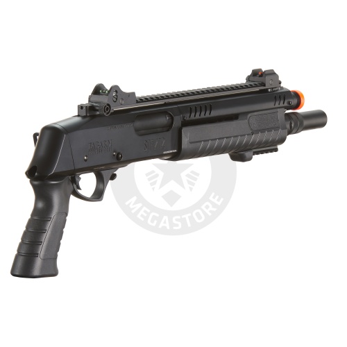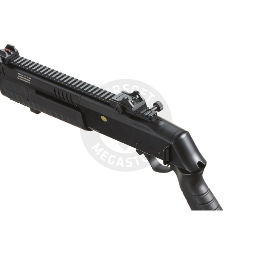 The BO Manufacture REP FABARM STF12 Short 11" Pump Action Shotgun, available at Airsoft Megastore, is a powerful and compact weapon designed for airsoft enthusiasts. Officially licensed by FABARM, this shotgun features a robust polymer build with a barrel assembly for durability. The ergonomic pistol grip ensures comfort during use, while the uniquely designed fore-end provides enhanced grip for smoother pump action. Equipped with a 20mm Picatinny under rail, it allows for the attachment of foregrips, and the removable front and rear sights improve target acquisition. With a muzzle velocity of 300-310 FPS, this gas-powered shotgun delivers reliable performance in any scenario.
