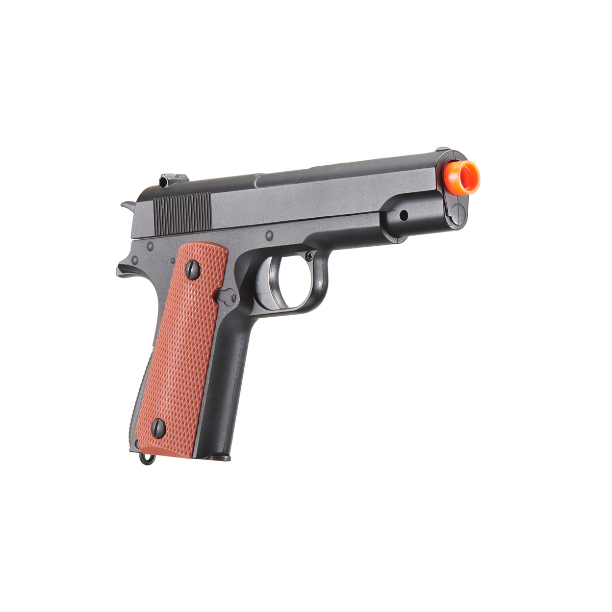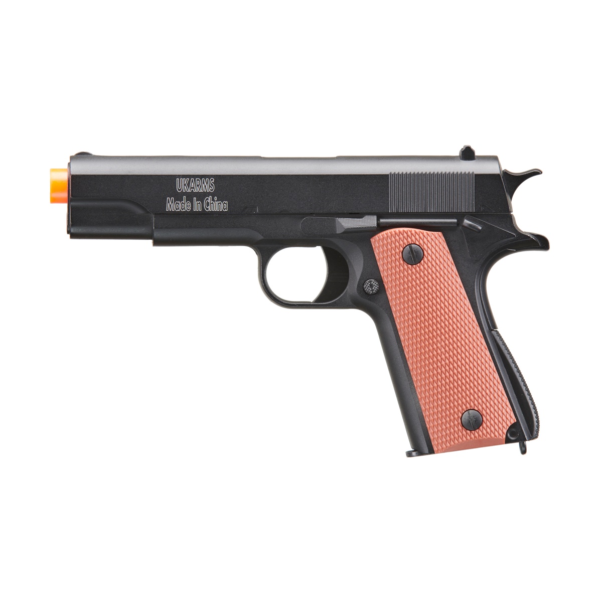 UK Arms 1911 Alloy Series Spring Airsoft Pistol in black with brown grip panels delivers classic styling and simple, dependable operation at a budget-friendly price. Built from a metal alloy slide and frame components paired with polymer parts, this single-shot spring pistol has a reassuring heft that feels close to the real 1911 while keeping overall weight around three-quarters of a pound for easy carry. Power is tuned for casual use at about 200 to 250 feet per second, making it a smart choice for backyard target practice, training reps, and costume or film work where reliability and consistent cycling matter. The spring-powered action is straightforward-rack the slide, press the trigger, and the pistol snaps back into battery ready for the next round. A 12-round magazine supports quick reloads, and the textured brown panels provide a confident grip that looks right at home on a classic profile.