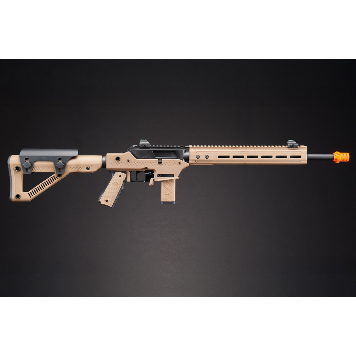 The Vorsk VMP-2D GBB Airsoft Rifle is a high-performance, semi-auto-only gas blowback rifle purpose-built for precision and power. Engineered as part of Vorsk's modular platform series, the VMP-2D excels as a designated marksman setup with its 410mm inner barrel and 1.9-joule muzzle energy, delivering long-range accuracy with consistent 450 FPS performance using 0.20g BBs. The rifle features realistic blowback action and ambidextrous fire controls that mirror real steel ergonomics, giving both left- and right-handed shooters full tactical confidence. Its rotary disc hop-up with TDC/VSR system provides precise control over trajectory, accessed conveniently from the upper flat-top rail. Whether you're engaging from a distance or outfitting a semi-locked field loadout, the VMP-2D delivers pinpoint consistency and realism. Built from premium materials, the VMP-2D combines a CNC-machined aluminum alloy upper with a high-impact polymer lower and handguard for a lightweight yet rugged frame. The 20mm flat-top rail includes front and rear fiber optic sights and additional rail space for scopes, lights, or lasers. The fixed DMR-style stock comes with an adjustable cheek riser, while the 6-position extendable buffer tube offers custom fitment. Sling compatibility is ensured with four ambidextrous QD points. This rifle accepts 14mm barrel attachments like suppressors or tracer units and is supplied with a 20-round gas magazine, fully compatible with other VORSK VMP mags. Ideal for players seeking reliable, realistic airsoft rifles with modular adaptability, the VMP-2D is a top-tier choice for outdoor precision roles and training platforms alike. With its GBB system, AR15 spec modularity, and field-tuned performance, this rifle is ready to dominate at distance while staying true to a clean, semi-automatic platform.