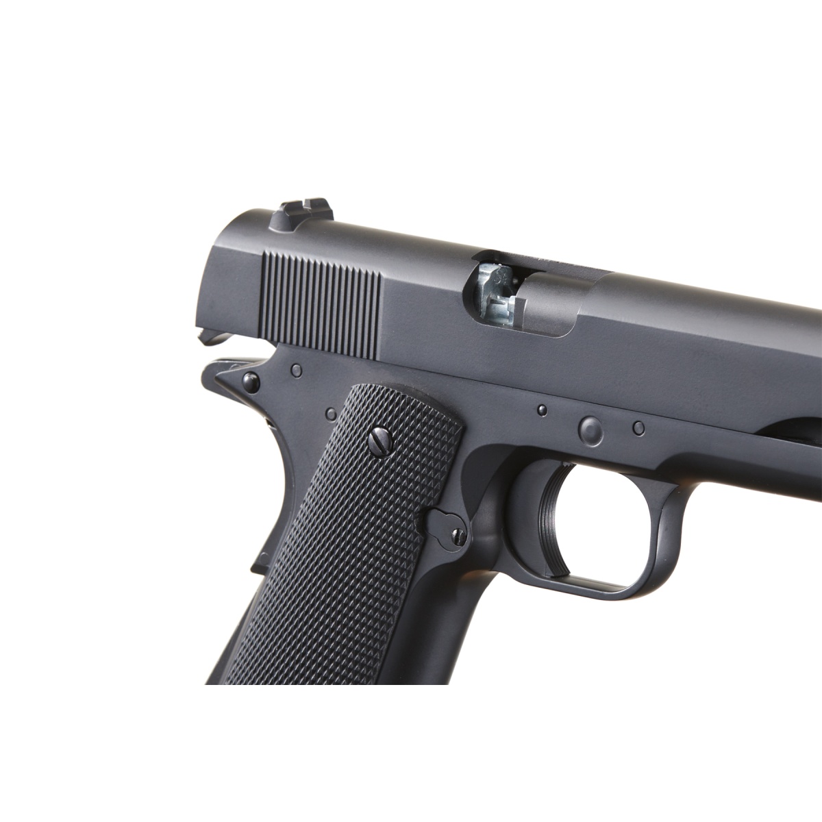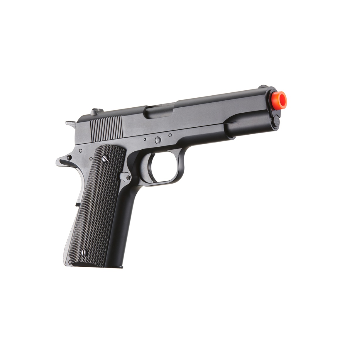 The WinGun Full Metal Sport 613 1911 CO2 Half Blowback Pistol in black is a rugged and realistic airsoft sidearm built for performance and efficiency. Constructed with a full metal slide and frame paired with textured polymer grip panels, this pistol replicates the feel and weight of a real 1911, making it ideal for training, skirmishes, or collection. Powered by CO2, the Sport 613 features a unique half blowback system that reduces gas consumption by only cycling the slide halfway, increasing efficiency and allowing up to 100 shots per cartridge. Firing at an impressive 380 to 400 FPS with 0.20g BBs, it offers the speed and power competitive players demand for CQB and field use alike. The adjustable hop-up system lets you fine-tune accuracy and range, while standard 1911-style iron sights provide fast target acquisition. Tactical features add to this pistol's battlefield advantage. A serrated slide ensures positive grip for easier racking, and the integrated Allen key stored within the magwell means you'll never be caught unprepared during reloads or CO2 changes. Its 15-round metal magazine delivers dependable feeding, while the semi-automatic action keeps response tight and predictable. Measuring 9 inches in length and weighing 2 pounds, the WinGun Sport 613 fits comfortably in most 1911 holsters and retains a classic tactical profile. Whether you're building a reliable secondary for your airsoft loadout or want a powerful CO2 pistol with enhanced gas management, this 1911 delivers durability, realism, and consistent shooting in one sleek, field-ready package. Perfect for airsoft players seeking power, efficiency, and authentic styling, the Sport 613 is a smart choice for both new and experienced players looking for a trusted performance pistol.