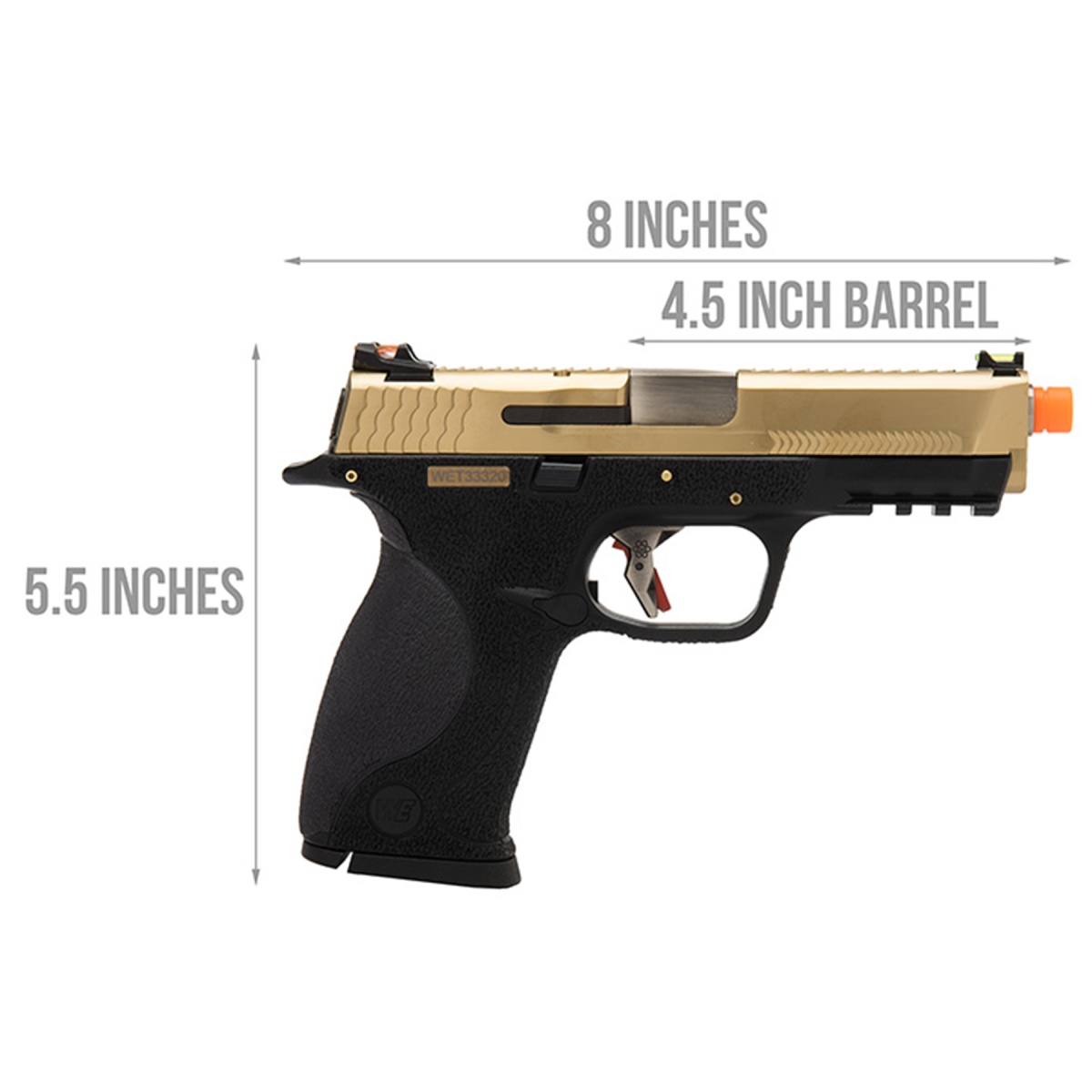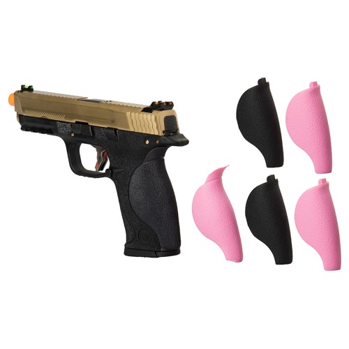 The WE Tech Big Bird W.E.T Full Metal Gas Blowback Airsoft Pistol in Titanium Gold delivers a high-performance sidearm experience with striking aesthetics and reliable function. Designed with a full metal upper and a polymer frame, this pistol replicates the weight and feel of a real firearm while staying airsoft-optimized. Firing at 290 to 300 FPS with 0.20g BBs, it features realistic blowback action, a locking slide on empty, and adjustable hop-up for precision shooting. The 22-round magazine runs on green gas and has a rapid cooldown-to-ready cycle, allowing fast reloading and consistent performance in intense scenarios. Ergonomics and customization are at the forefront with this model. The pistol includes five interchangeable backstraps, offering a tailored fit for any shooter. A stippled grip texture provides solid handling, and an upgraded trigger with built-in safety minimizes the chance of misfires. The integrated Picatinny rail beneath the barrel supports tactical attachments like lights or lasers. With bright red and green fiber optic sights, players can acquire targets quickly in both indoor and outdoor environments. The Titanium Gold finish adds a bold, standout look without compromising durability. Whether you're an experienced player looking to upgrade your loadout or a collector seeking something stylish and functional, the WE Tech Big Bird is a top-tier gas blowback pistol engineered for dependable use and modern performance.