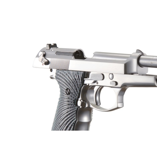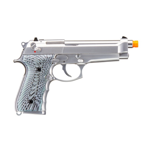 The WE-Tech New System M92 Eagle Full Auto Gas Blowback Pistol is a sleek and aggressive take on the classic M9 platform, finished in silver with custom eagle-themed grip panels. Designed with both form and function in mind, this full metal airsoft sidearm features an aluminum alloy slide and frame for maximum realism and durability. Powered by green gas, it delivers reliable performance with a muzzle velocity of 320 to 330 FPS using standard 0.20g BBs. Whether you're running full-auto for suppressive fire or switching to semi-auto for precision shots, the slide-mounted fire selector gives you easy control over firing modes. WE-Tech's upgraded internal system enhances gas efficiency for better shot consistency and overall performance. This M92 Eagle pistol includes a number of functional enhancements that elevate its role on the field. The blowback system replicates realistic slide action for immersive gameplay, while the adjustable hop-up lets you fine-tune accuracy based on BB weight and range. The integrated lanyard loop at the base of the grip ensures secure retention, especially for sidearm-heavy loadouts. A double-action trigger pull and enlarged trigger guard make it comfortable for fast, responsive shooting. With its striking silver finish, engraved eagle grips, and full-auto capability, this WE-Tech M92 Eagle is perfect for players who want standout looks with top-tier performance in an airsoft gas blowback pistol. Whether for CQB, outdoor matches, or collection display, this sidearm offers a blend of functionality, realism, and flair.